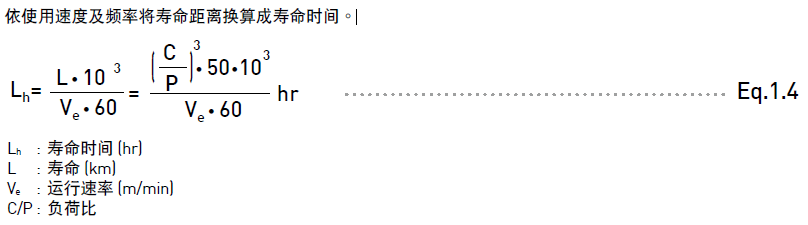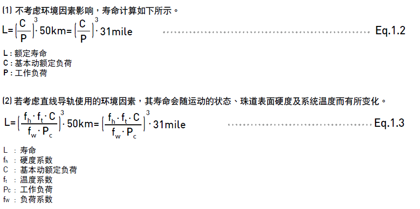 直線導軌的壽命會因實際承受工作負荷而不同,可依選用之直線導軌的基本動額定負荷及工作負荷推算出使用壽命。