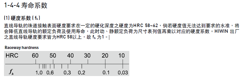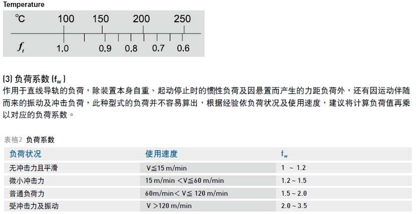 系統溫度會對直線導軌的材質有影響,當溫度高于100oC時直線導軌的額定負荷及使用壽命將會降低,此時動、靜額定負荷為尺寸表列值再乘以對應的溫度系數。由于有些配件是塑料材質較不耐高溫,故建議使用溫度應低于100oC。